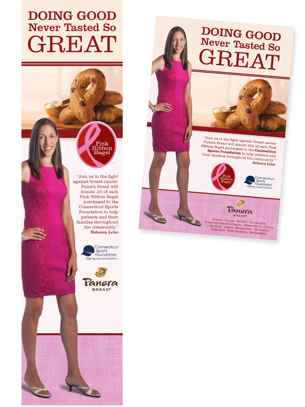 Panera’s partnership with the ESPN basketball analyst and former UConn and WNBA star tipped off in October during Breast Cancer Awareness Month with the Pink Ribbon Bagel campaign. Panera franchise-owner Howley Bread Group donated 25 cents from each Pink Ribbon Bagel purchased to the CT Sports Foundation Against Cancer, which provides funds to families battling cancer to help them pay their household bills during treatment. We managed public relations and designed the point-of-purchase materials, including a life-size banner (Rebecca is 6’ 4”!) in each Panera/HBG bakery-café.